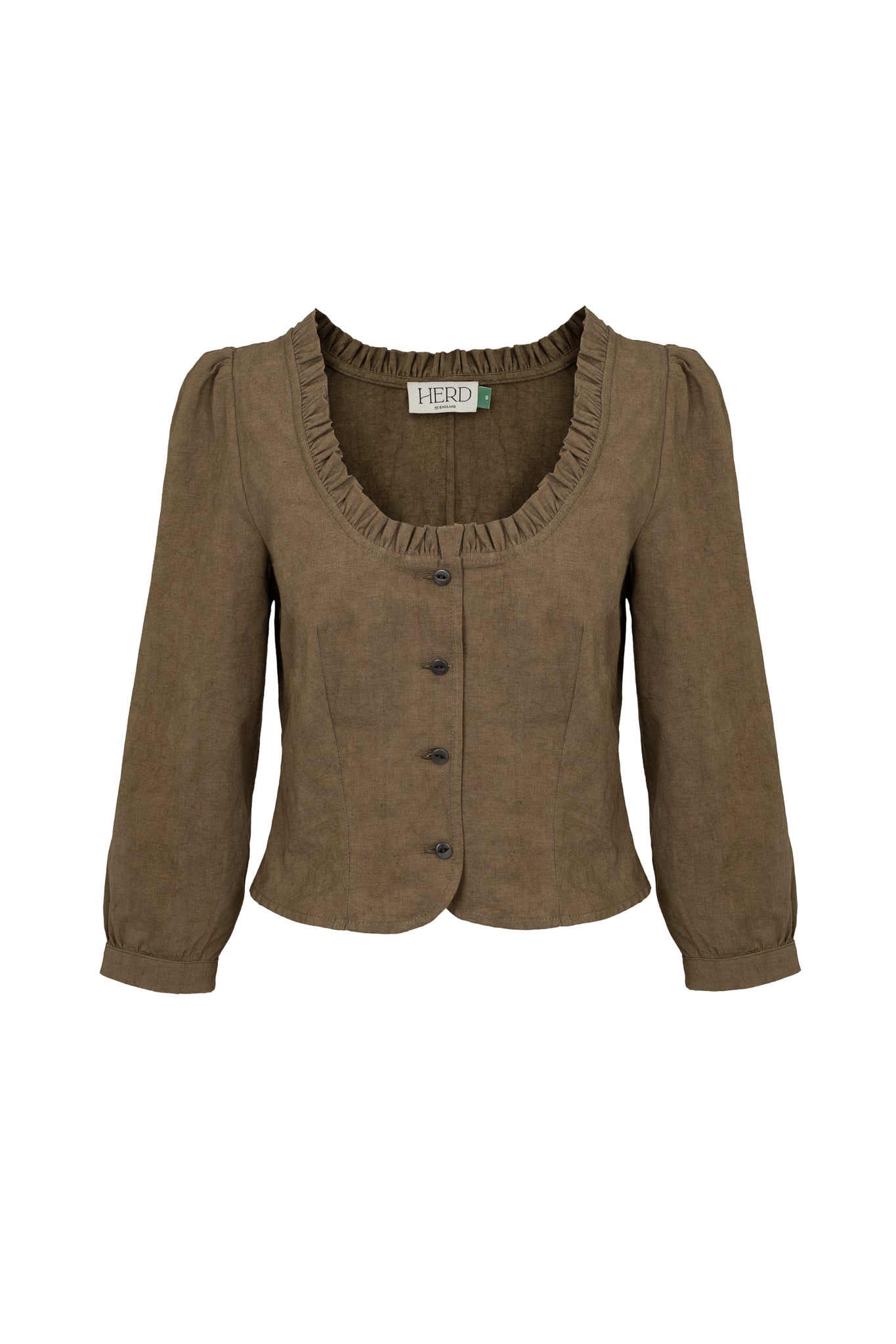 Romantic yet earth-bound, the Dabinett Bodice is fitted with a scooped, frilled neckline and three-quarter length sleeves. Wear with the Campion Skirt in Walnut and boots for a ideal autumnal outfit.