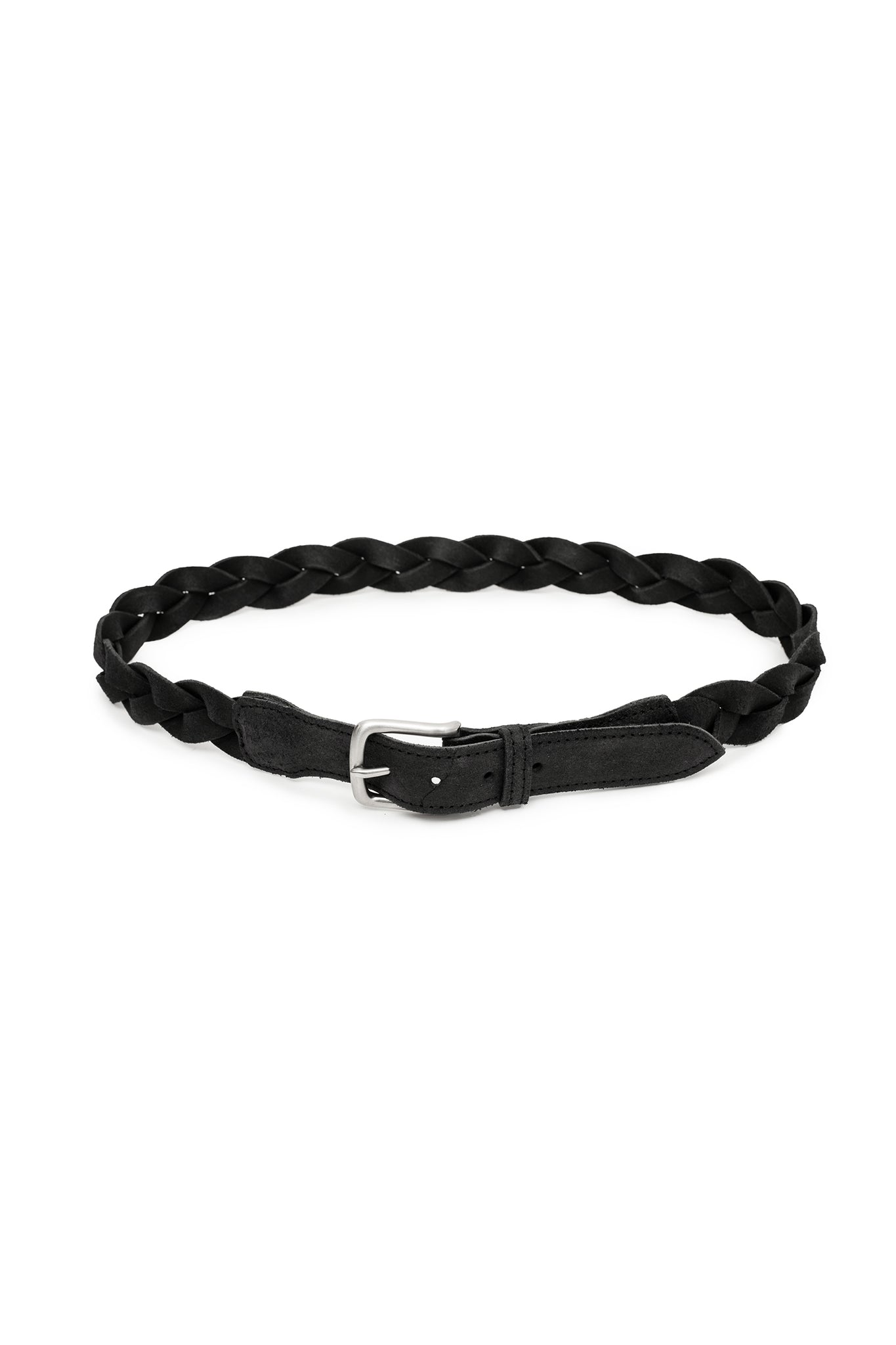 A slim, plaited belt in matte British suede, hand-made in heritage leather-making English town Walsall. Nickel buckle.