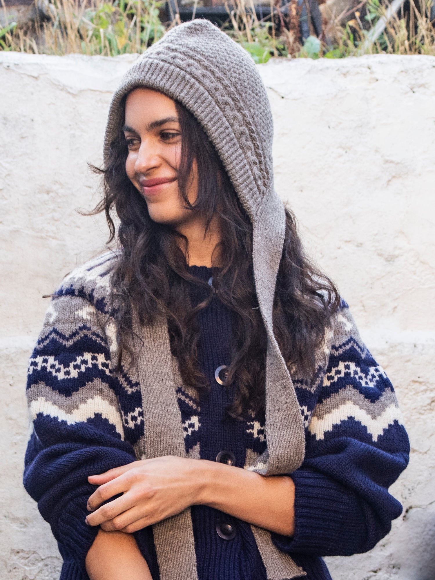The Whitby Collection, named for the historic seaside Yorkshire town, is a four-piece cable knit collection, based on traditional aran cable designs. Originally crafted for seafaring and keeping fisherman warm at sea, the cable designs have meanings signifying good luck for the catch and the weather, and draw on the natural world in their design.