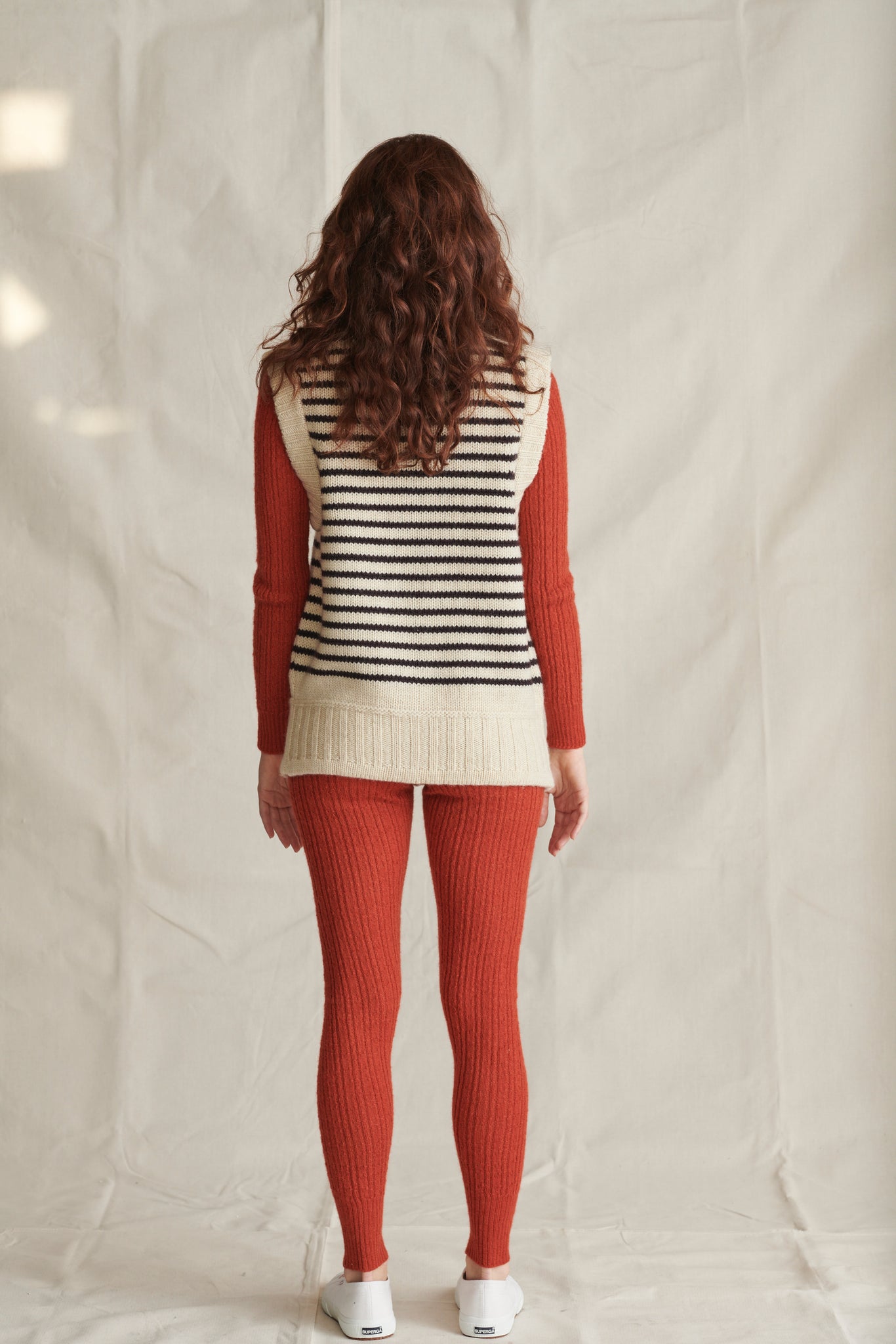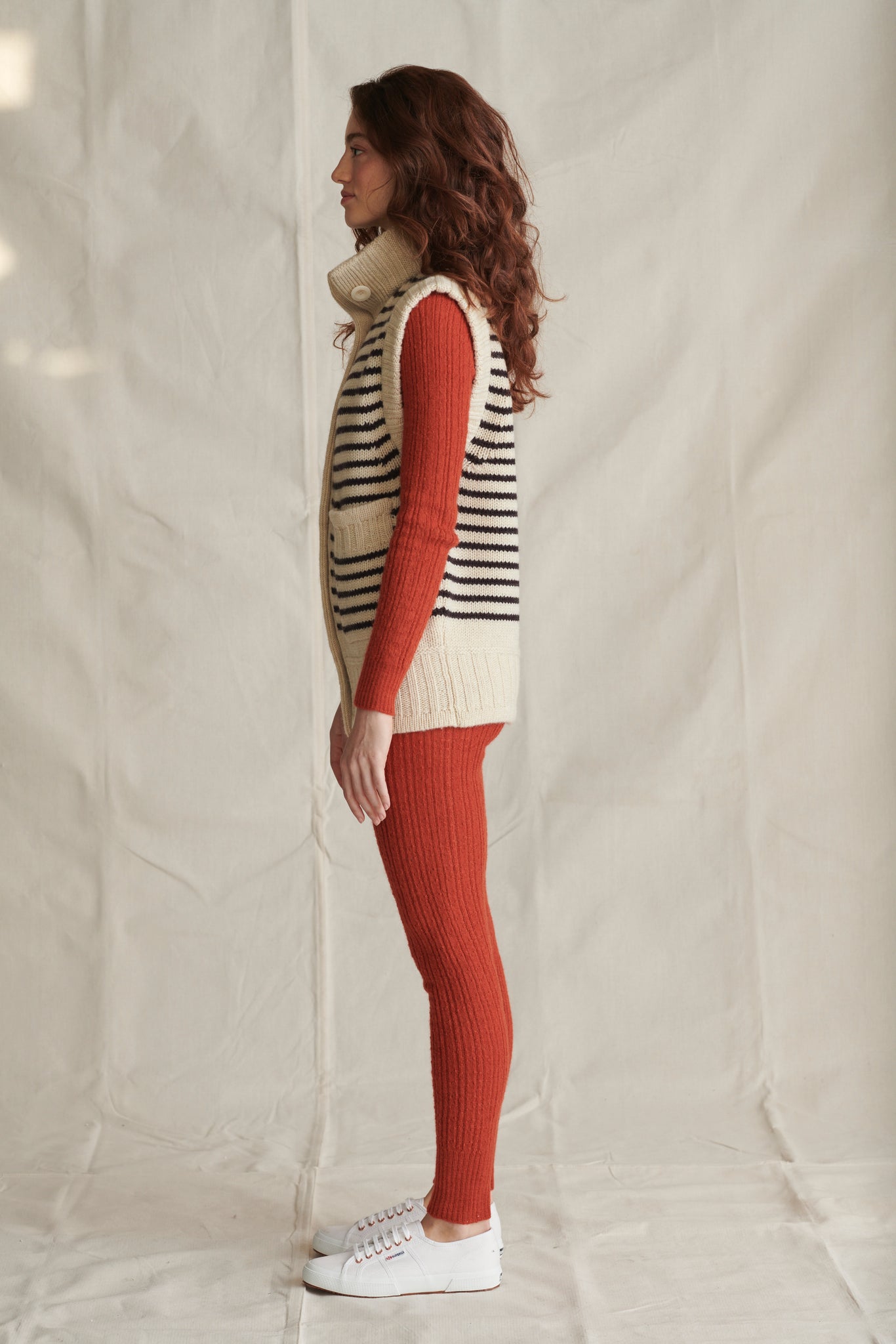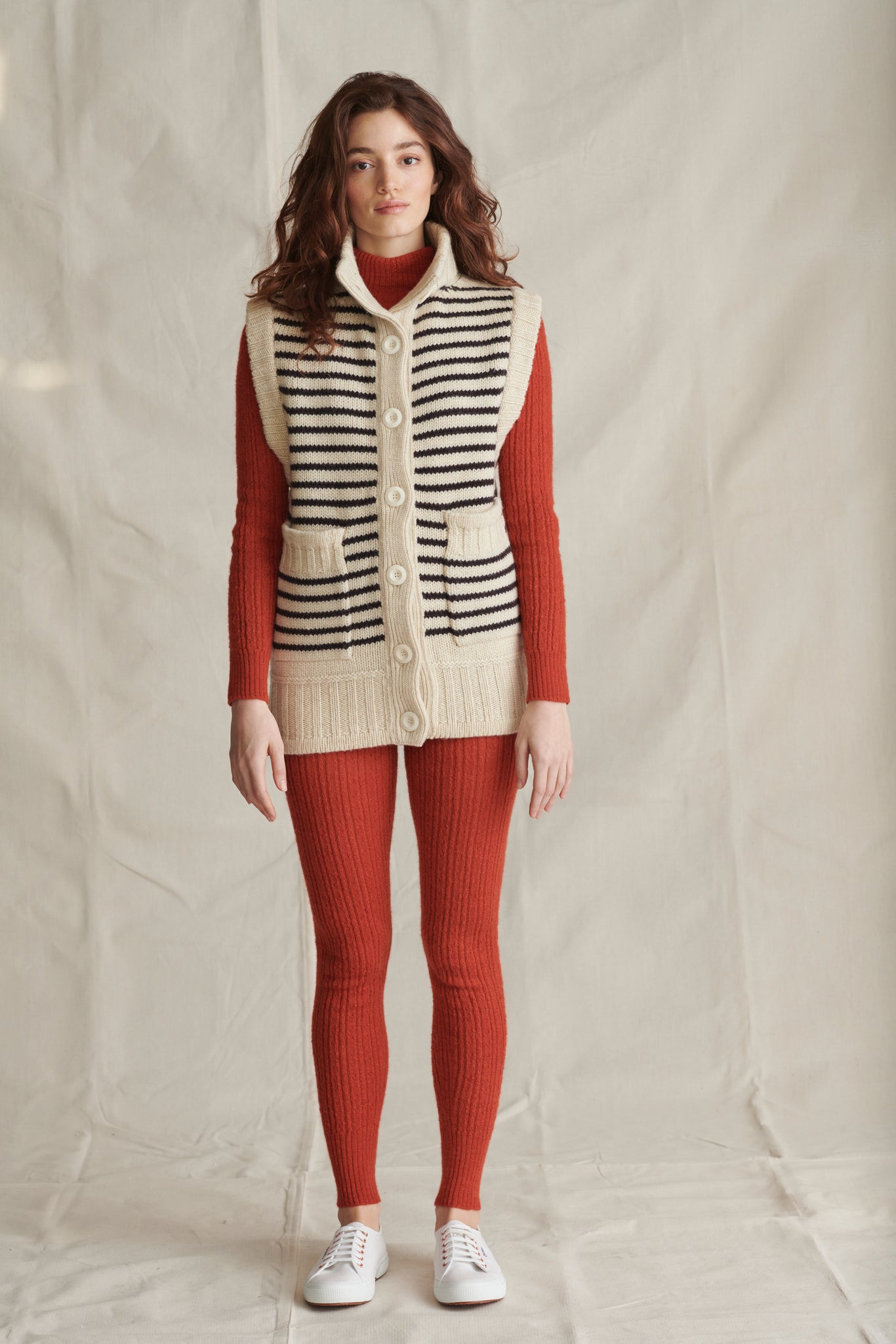 This gilet, lustrously thick and weighty (but not heavy) is to be worn throughout the year over absolutely everything. Doubled-up collar, deep armholes, pockets and great big buttons add to its' cosy and utilitarian and yet casually elegant appeal.