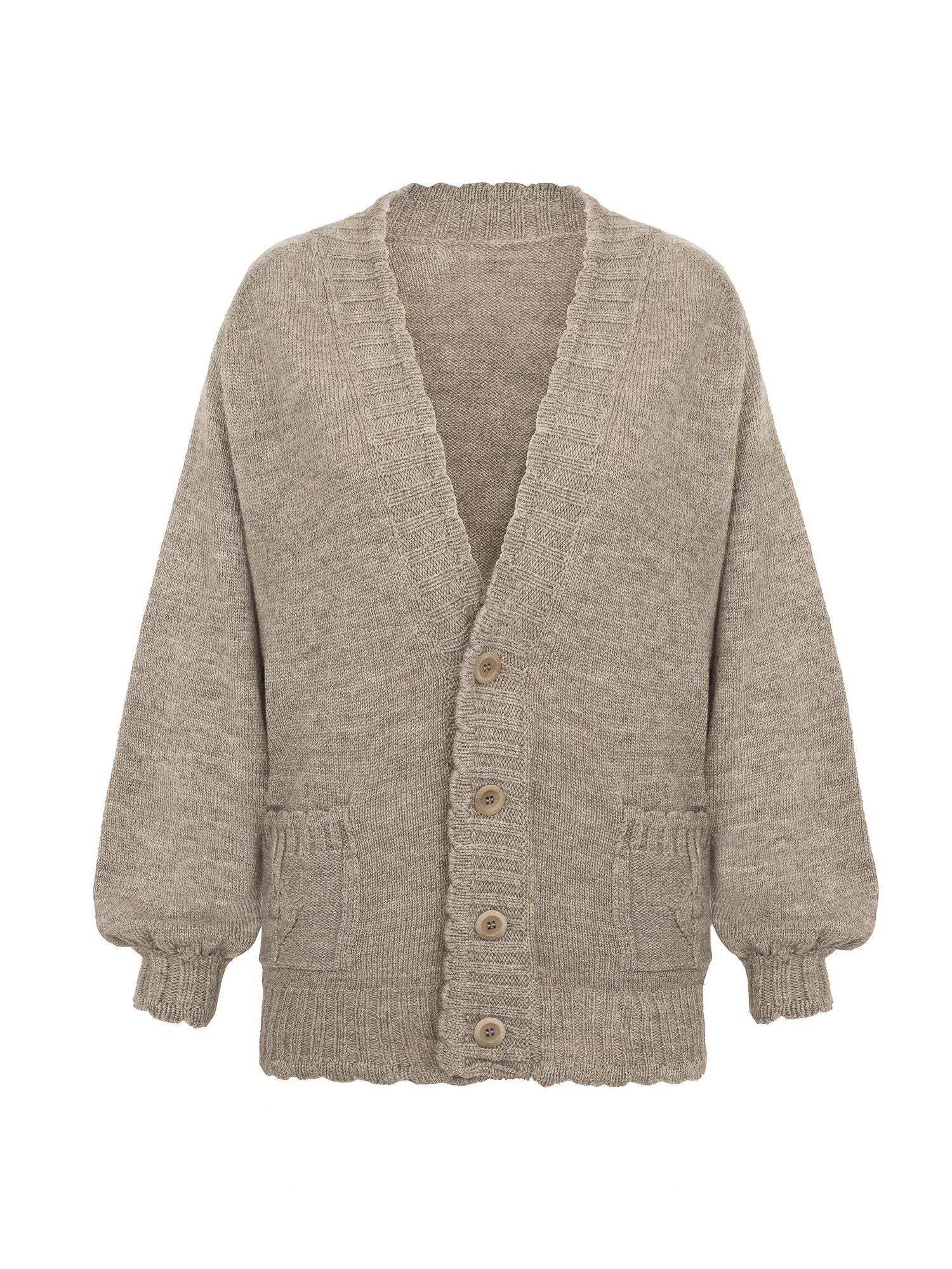 Vintage hand-knit inspired, this knit is long country walk, cup-of-tea-in-a-china-cup and silk dress in front of a roaring fireplace rolled into one. Knit in a luxurious weight this cardigan is to be slung on as a cardy-coat in autumn and then layered in the depth of winter to keep the draughts and chill out.